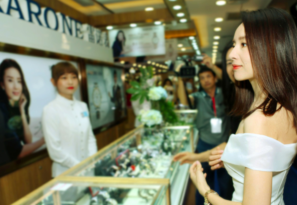 優(yōu)雅女神董潔一身梨白小禮服驚喜現(xiàn)身雷諾表專柜,一同品鑒雷諾新品腕表。